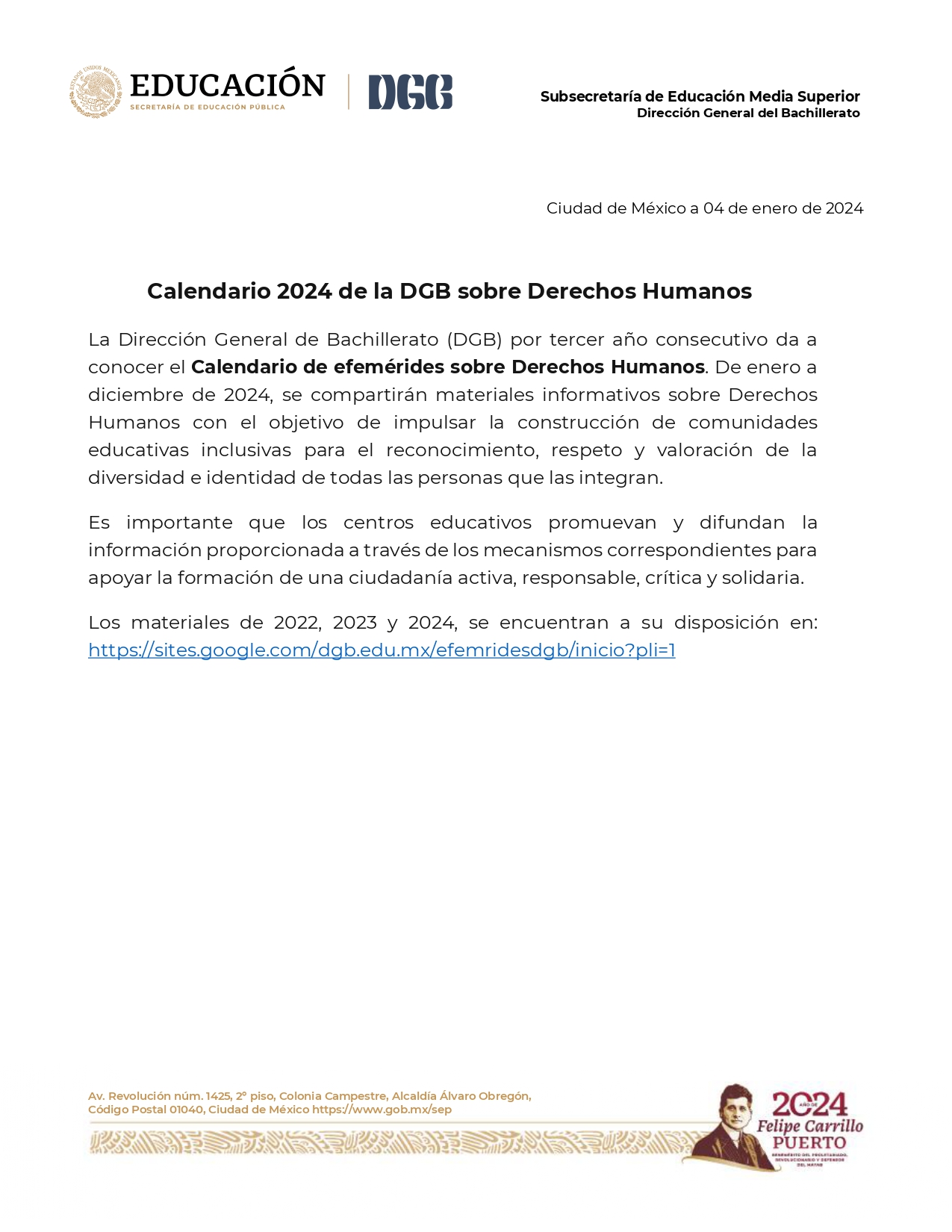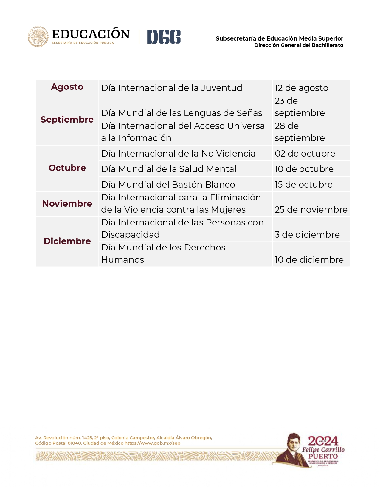Con el objetivo de contribuir a la construcción de comunidades educativas inclusivas para el reconocimiento, respeto y valoración de la diversidad e identidad de todas las personas que las integran, por tercer año consecutivo, la Dirección General de Bachillerato (DGB) impulsa el Calendario de Efemérides sobre Derechos Humanos.
